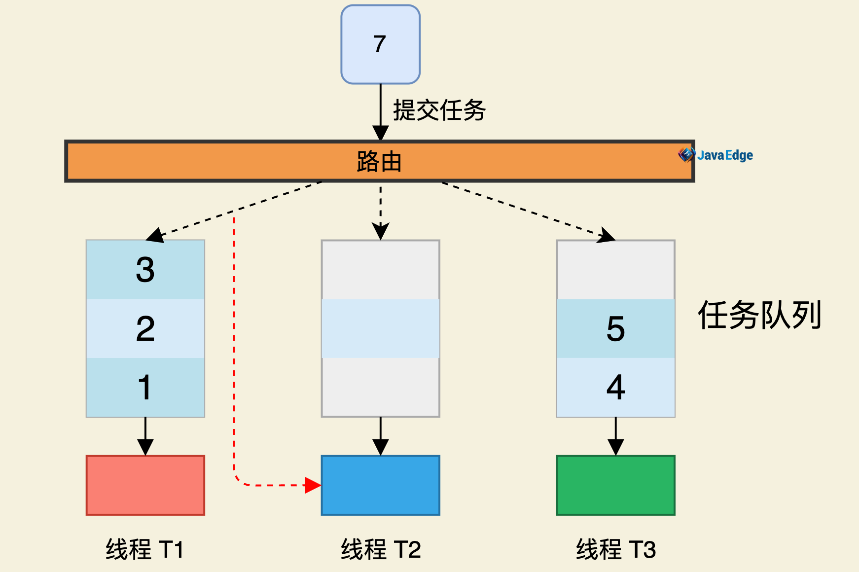 当调用ForkJoinPool#invoke()或submit()提交任务时,ForkJoinPool把任务通过路由规则提交到一个任务队列,若任务执行过程中会创建出子任务,则子任务会提交到工作线程对应的任务队列。
